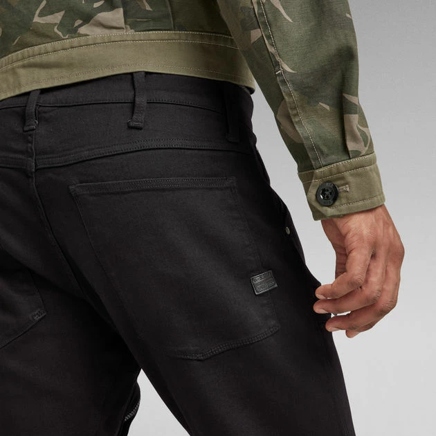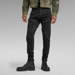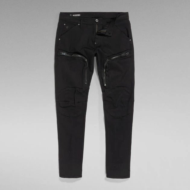 Rough zip pockets at upper leg distinguish the Air Defence zip skinny jeans. Inspired by fighter pilot suits that feature map pockets allowing the pilot to access them while seated during the flight. This pant is cut in a skinny silhouette with 3D legs, created by the inner leg paneling and knee seams. Additional inset pockets and patched on back pockets complete this style.