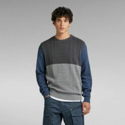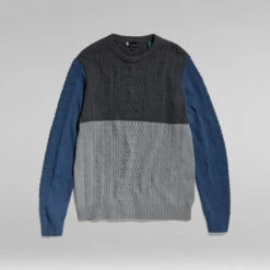 Knitted sweater Cable Color Block offers a loose fit. The contrast colored panels are emphasized by the knitted cable structure at the front and sleeves. Ribbed finishes add to a comfortable wear.