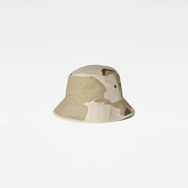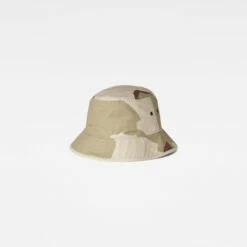 This season’s bucket hat is designed in a camo printed woven fabric. Alike the original, the brim is reinforced with several rows of stitching and the edge is bounded. The woven G-Star Originals label at the front signs this camo bucket hat off.