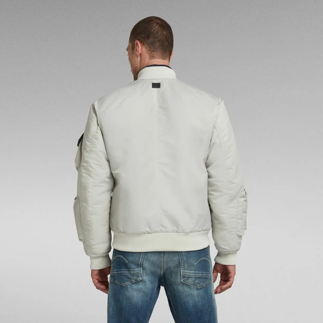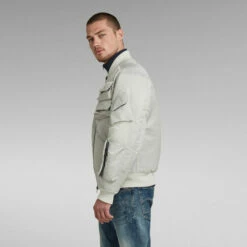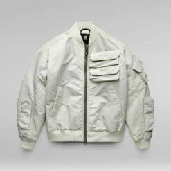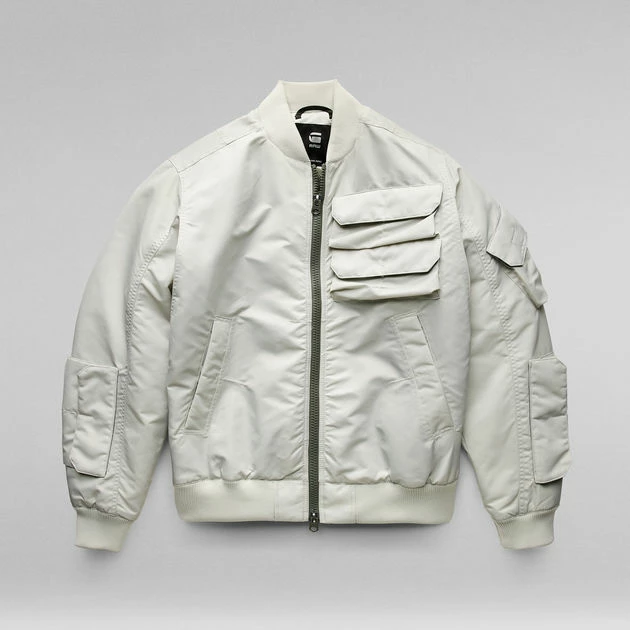 Bomber Chest Pocket offers patched on pockets with multiple compartments at the chest, bicep and lower sleeves. Welt pockets are added to the waist. Offer a hidden snap, concealed under a ‘strike through’ embroidery stitch. This jacket features a 2-way zipper with a wind guard underneath. Ribbed finished edges add to a comfortable wear. An inner pocket and hanger loop are added to the lined inside.