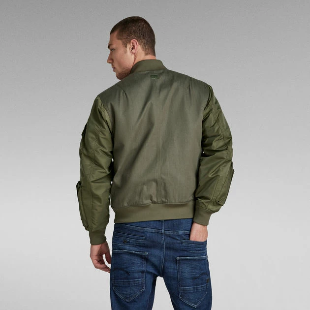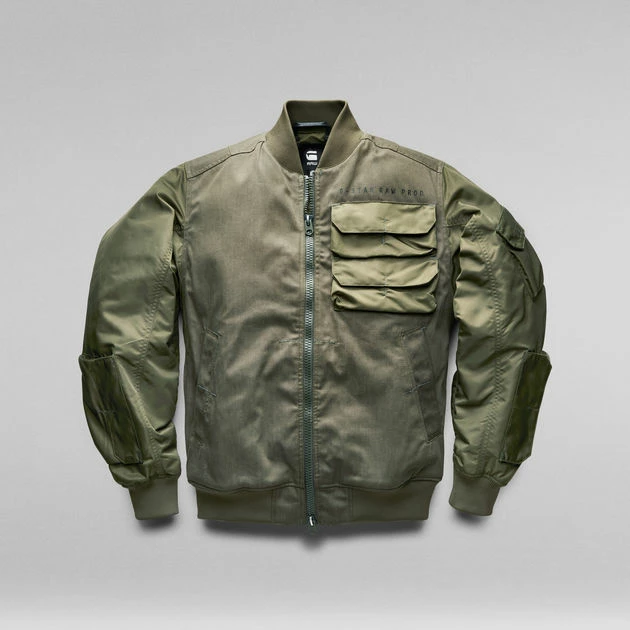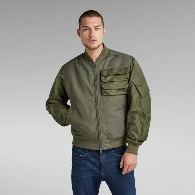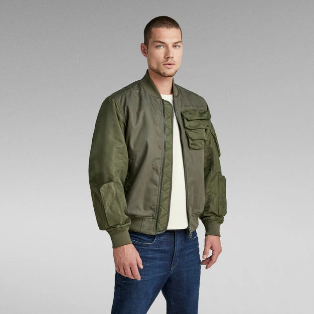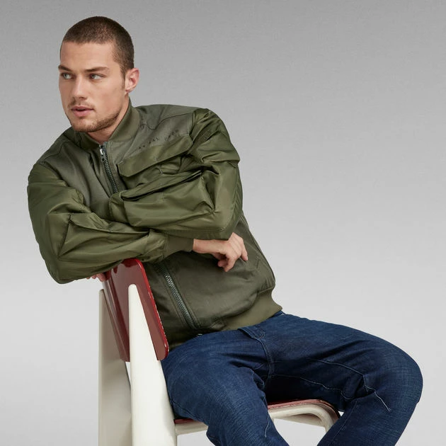 Bomber Chest Pocket PM shows patched on pockets with multiple compartments at the chest, bicep and lower sleeves. Welt pockets are added to the waist and offer a hidden snap, concealed under a ‘strike through’ embroidery stitch. This bomber jacket features a 2-way zipper with a wind guard underneath. Ribbed finished edges add to a comfortable wear, while an additional inner pocket and hanger loop are added for ease.