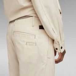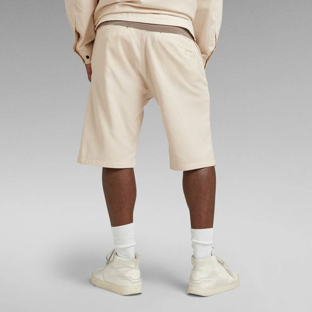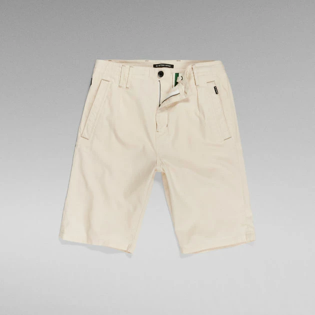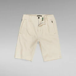 Trainer Cosy fits straight through the hip and thigh where it tapers softly towards the knee. Pleats at the front add to a comfortable, relaxed fit. Use the woven tape inside the waistband to determine a personalized width. The waist pockets are finished with a welt and filler cord. The welt pockets at the back are combined with a ticket pocket underneath. These woven shorts have a zip fly.