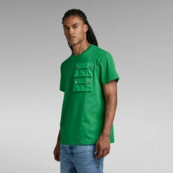 Organic cotton T-shirt Double Pocket Utility is designed in a loose fit and features woven flap pockets with snap buttons at the chest. The ‘strike through’ embroidery stitch indicates the center. This short sleeved T-Shirt shows a graphic print at the back shoulder.