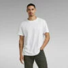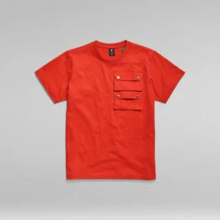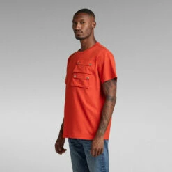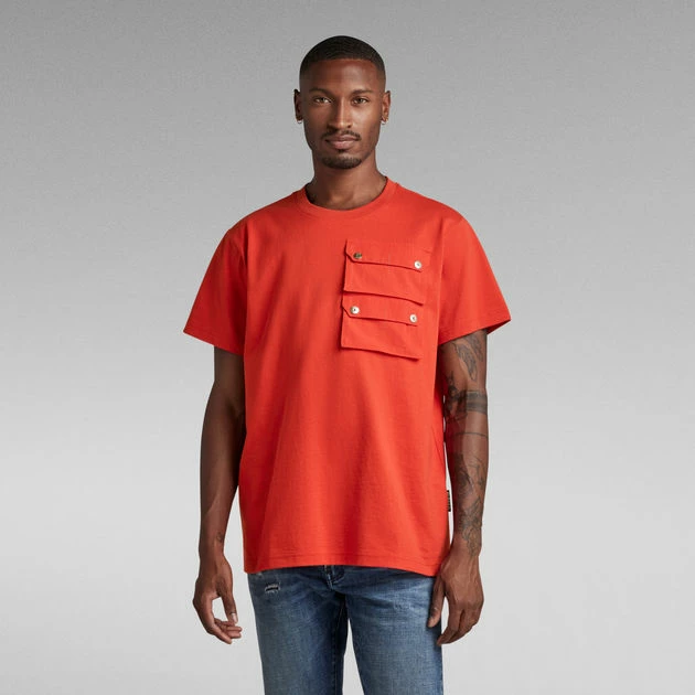Organic cotton T-shirt Double Pocket Utility is designed in a loose fit and features woven flap pockets with snap buttons at the chest. The ‘strike through’ embroidery stitch indicates the center. This short-sleeved T-Shirt shows a graphic print at the back shoulder.