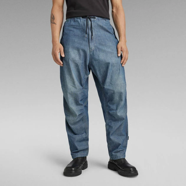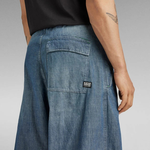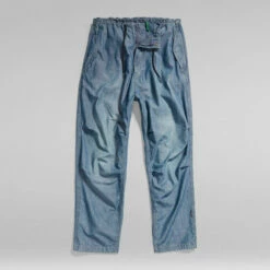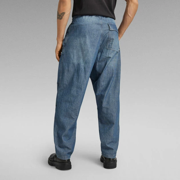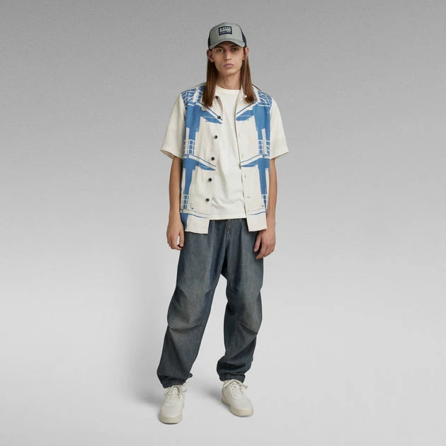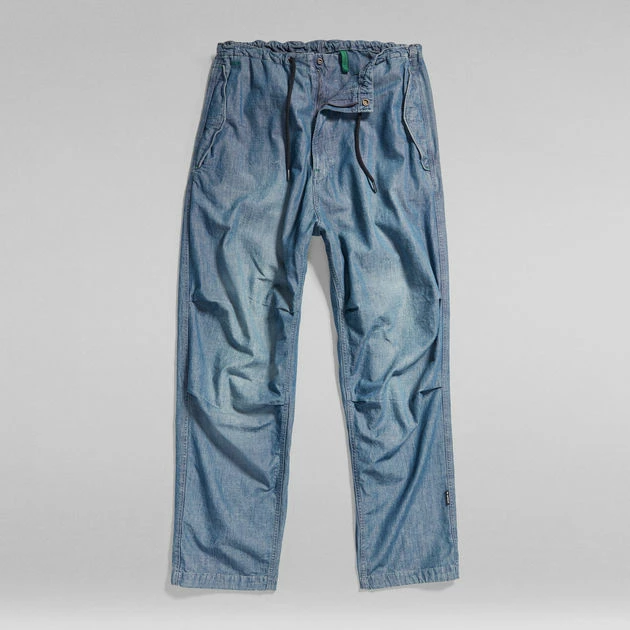 Inspired by military snow camo pants from our archive, these GSRR Drawstring pants offer a straight fit with a 3D-effect at the knees. The pleats at both sides add shape and volume. Additional volume can be created at the ankles, by tightening the leg hems with the inside tapes. The hidden snap closures at the pockets are emphasized by a ‘strike through’ embroidery.