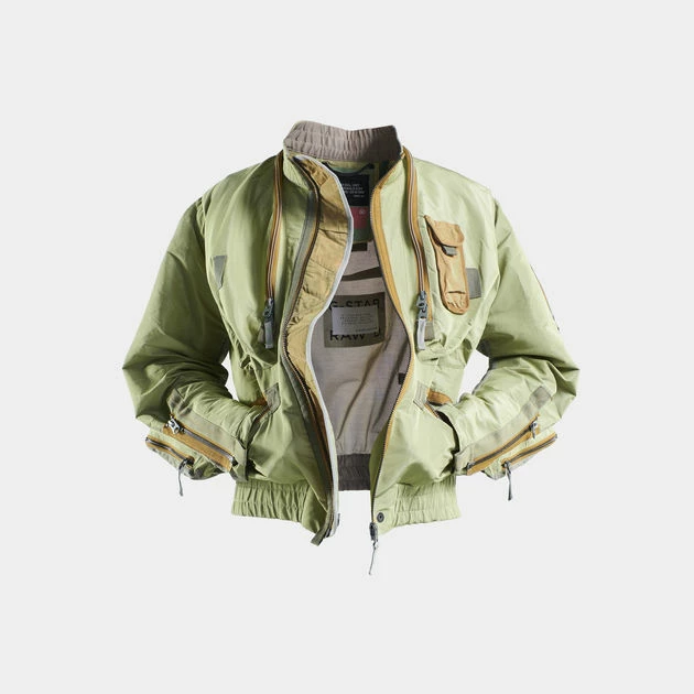 Bomber jacket E 24H Turtle is designed in a straight fit and offers many details. All sort of bellows pockets are created with zippers. At the chest a deep version is set with a 2-way zipper and has a smaller flap pocket on top. Horizontal zipper pockets are placed at the waist. Also the sleeves of this bomber show 3D zipper pockets. A see through insert is added to one of the lower sleeve pockets. By closing the zippers at the wrist, a tighter cuff can be created. Woven tapes are added for reinforcement. This jacket shows a raised collar with a stretchable feature alike the waist.