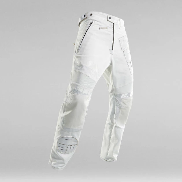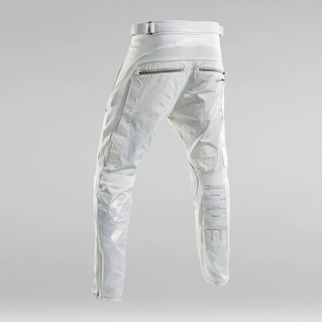Moto pants Advert E are part of the Extremes collection, where timeless pieces are created by merging innovation with craftsmanship. A detailed design created out of selvedge canvas, twill and knitted rib detailing for ease of movement. The applications throughout these pants are created by printing and embroidery techniques. Details at the zip pockets and waist tabs are made from cows leather. The zips at the bottom of the tapered legs allow for an easy entrance.
