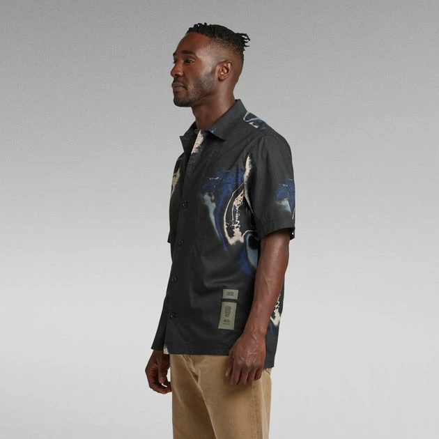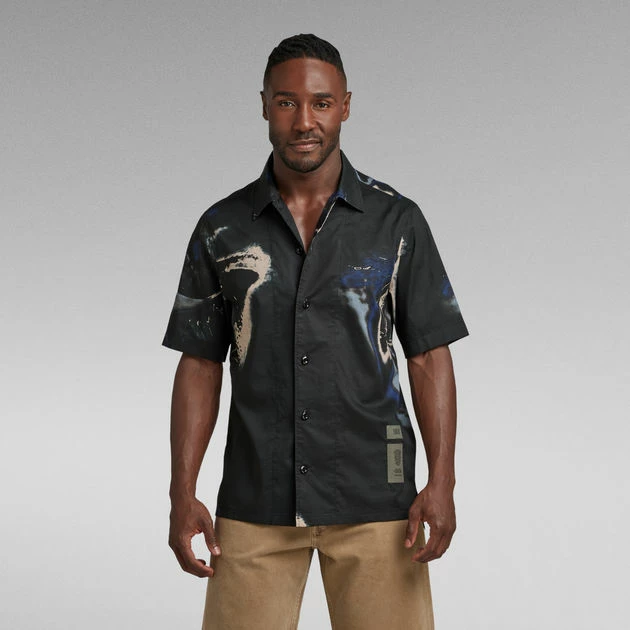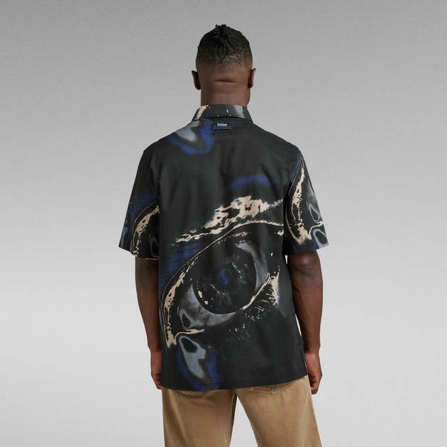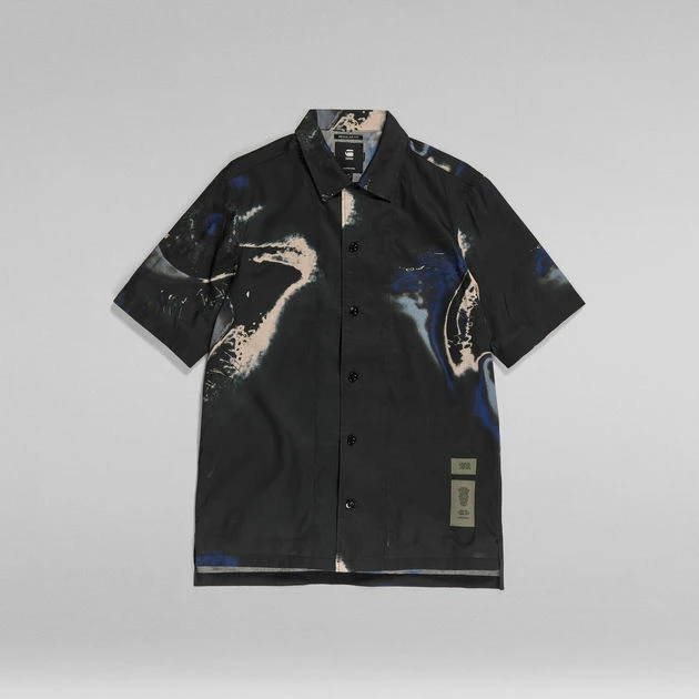 Shirt Festival is designed in a straight fit and offers semi short sleeves. The open collar shows a small loop at the side to create a closed version when preferred. A loop detail with a stitch down effect is placed at the upper back. Printed labels at the lower front complete it.