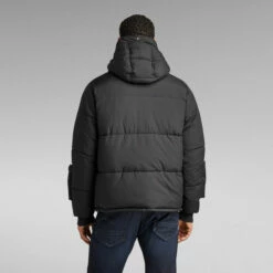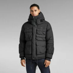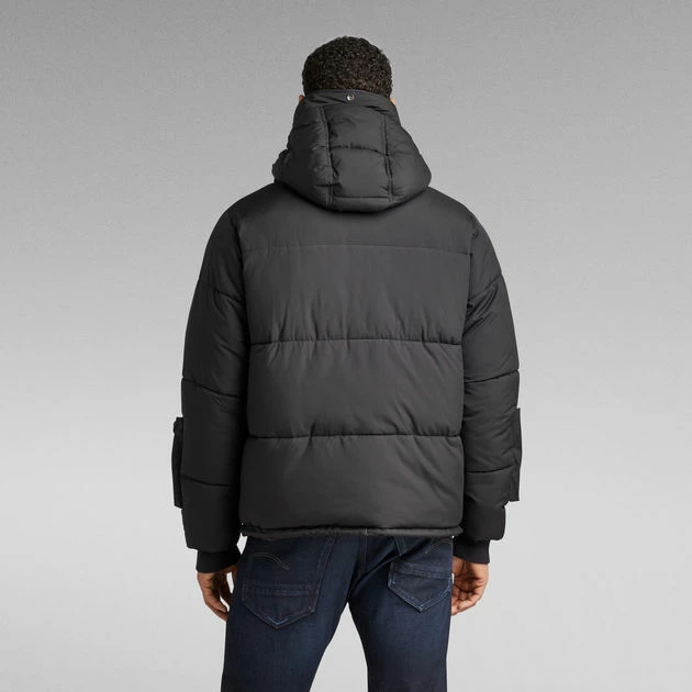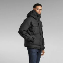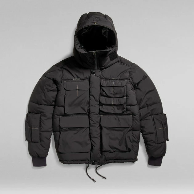 Hooded puffer jacket Field shows multiple 3D flap pockets at the front and lower sleeves. Also at the waist pockets are created, offering a side entry pocket underneath. The peak hood has a raised front with a Velcro tab. This tab can be folded backwards when not in use. Drawstrings at the waist allow for a more voluminous look when tightened. Inside, an additional pocket is set and combined with a hanger loop. Ribbed cuffs add to a comfortable wear.