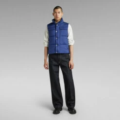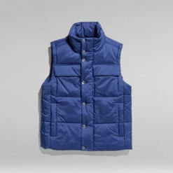 Body warmer Foundation is cut from a water repellent fabric and stitched through horizontally. The raised collar and smooth fit around the armhole create a comfortable style. The zipper closure at the front of this padded vest is covered by a wind blocker with snap buttons. Welt pockets at the waist are combined with flap pockets at the chest. Both offer a concealed snap button closure. Inside, an additional pocket is created to complete this sleeveless padded jacket.
