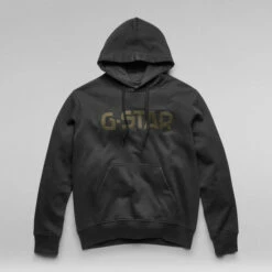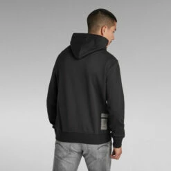 Hooded sweater G-Star features a kangaroo pocket and a hood with a drawstring. The front shows a cross over construction. Long sleeves have a ribbed edge alike the waist. The chest offers a graphic application created out of felt. The printed woven labels at the back add the final touch.