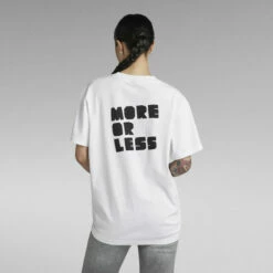 G-Star RAW and designer Maarten Baas joined forces to create art pieces made of denim waste shown during the ‘More or Less’ exhibition at Milan Design Week. A collaboration about our everyday dilemma and ongoing pursuit to make more out of less. Additionally, the ‘More or Less’ capsule collection was created. This statement tee offers a comfortable loose fit and ribbed neckline in organic cotton. The ‘More or Less’ print at the back is created in the signature font of Maarten Baas. The graphic print at one of the sleeves signs it off. This piece is offered in a limited edition.