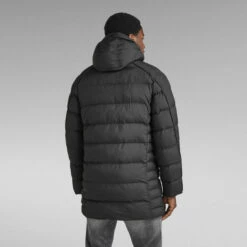 This G-Whistler hooded padded parka is cut from a water repellent fabric, quilted in a horizontal stitch down. The detachable peak hood is constructed with a high raised front and offers pull cords inside for optimum protection. The peak can be fixated if preferred. The front zipper closure is covered by a panel with snaps to block out the wind. Also the waist is adjustable, as there is a puller cord hidden inside. A heavy piping runs alongside the back of the sleeves. This padded jacket offers pockets at the chest, waist as well as inside. The inside is finished with a graphic printed lining.