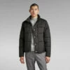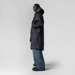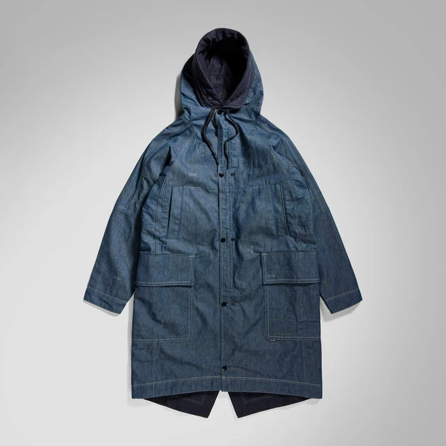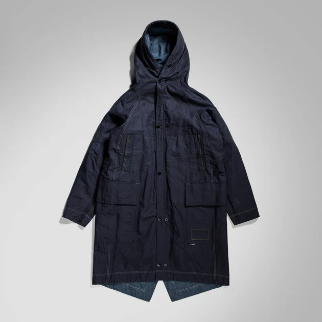 This G-Star Raw Research Parka is reversible. The design shows a raised front with a grown-on peak hood. Drawcords allow for a personalised fit. Welt pockets with a hidden snap are placed slanted at the chest, while the waist shows deep pockets with a flap. The inside shows the same pocket construction. The fishtail back adds even more detail to this GSRR parka.