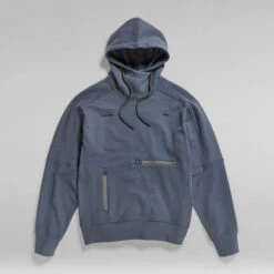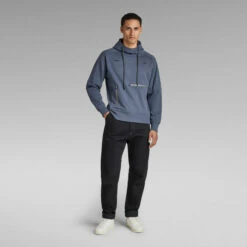 Hooded sweater Moto offers a relaxed fit. The hood is designed with a high raised front and drawstrings. Ribbed segments add to a comfortable wear. The pockets at the waist are finished with a zipper closure.