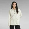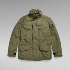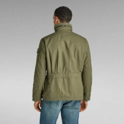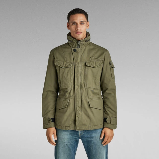 This padded field jacket shows multiple 3D flap pockets at the chest and upper sleeve. Also at the waist pockets are created. All of these have a hidden snap button closure. The raised collar offers a concealed hood with a drawcord. Inside this jacket, drawstrings are added to the waist allowing for a more voluminous look when tightened. The added hanger loop always comes in handy.