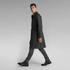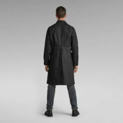 Deep, patched on waist pockets characterize this denim trench, offering a comfortable touch by the woolen lining inside. This knee length jacket offers a full button closure and a flat collar. Leaving the top button open, a lapel collar appears. This denim coat shows a flap pocket at the chest with a hidden snap closure. A stitched through loop is set just above. An inner pocket is added to the other side and is visible through the stitch down at the front. The adjustable long sleeves and added loop hanger, completes this Patched Pocket trench.