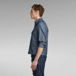 This shirt is created out of a finely woven chambray fabric, offering a characteristic color blend of blue and white.