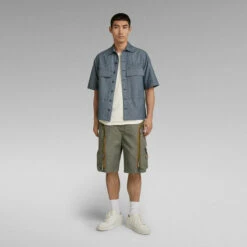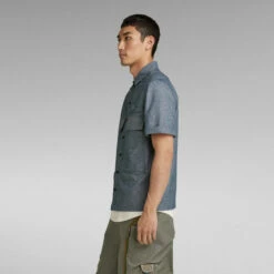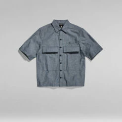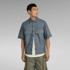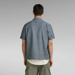 Overshirt Service Pocketony is cut in a straight fit, offering semi short sleeves. The open collar shows an additional buttonhole to allow for a fully closed version. This service shirt shows deep flap pockets with a snap button closure at the front. A loop with stitch down detail is added to the chest and upper back.