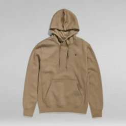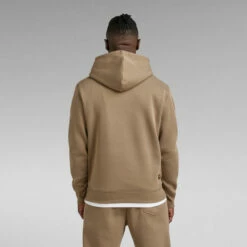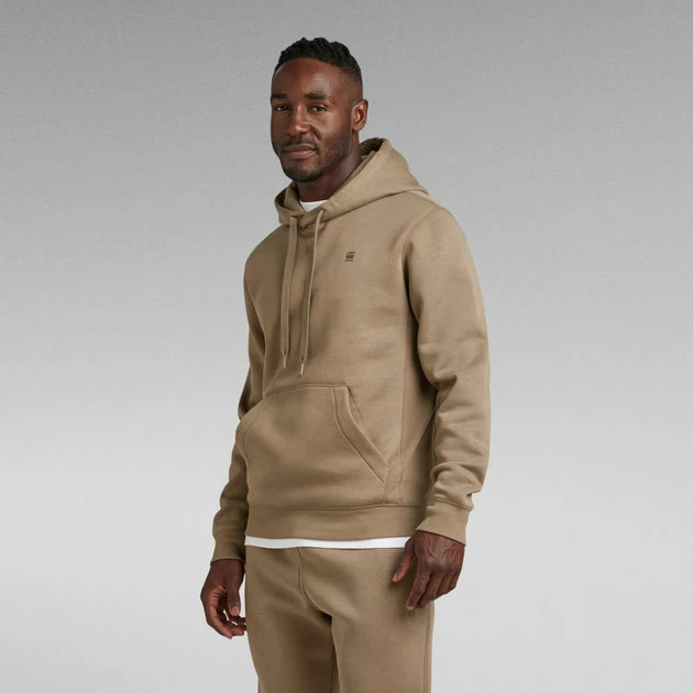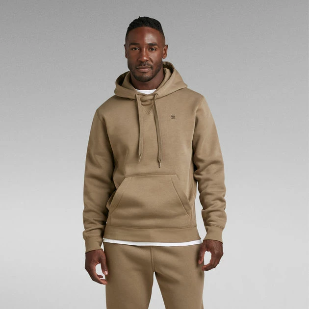 The Premium Core hooded sweater features a kangaroo pocket and a hood with a drawstring. The front shows a cross over construction and a ribbed inset piece. Long sleeves have a curved finish, showing a ribbed cuff underneath. The subtle G-Star RAW logo at the chest signs it off.