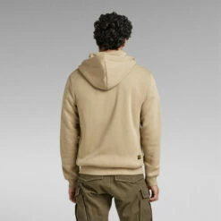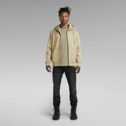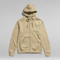 The Premium Core hooded zip through sweater features a split kangaroo pocket and a hood with a raised front and drawstrings. Long sleeves have a curved finish, showing a ribbed cuff underneath. The chest signs this hoodie with a subtle G-Star RAW logo.