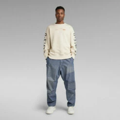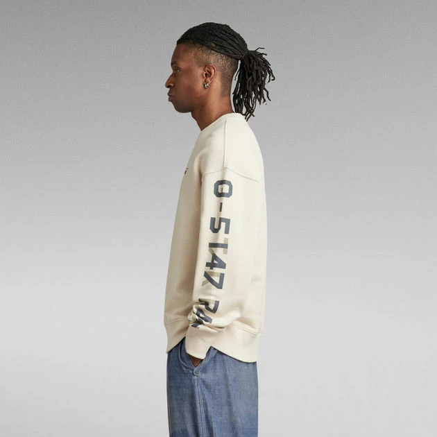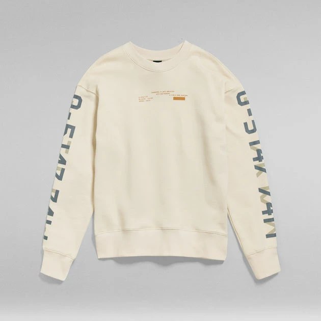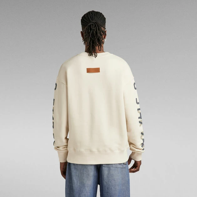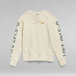 Sweater Sleeve Graphics features a roomy fit with a ribbed neckline, waist and cuffs. Graphic prints are added to the chest and sleeves. The woven tape loop at the upper back adds character.