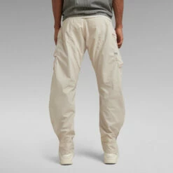 Cargo pants Sobiru offers a baggy fit to a point below the knees, where it abruptly narrows at the calves. This way high boots fit easily. Zippers are added to this section to allow for a quick access. Shape is created at the knees by precisely placed darts. Aside the single welt pockets at the waist and back, these cargo pants also offer 3D thigh pockets with a zipper closure and an extended pull cord. Underneath one of these, an additional side entry flap pocket is set.