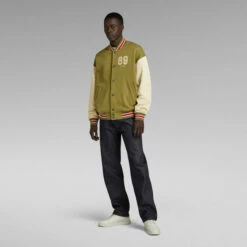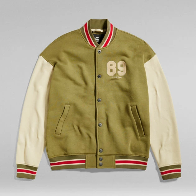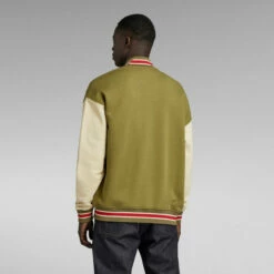 Sweater Bomber Sports features contrast colored sleeves and striped ribbed cuffs. Also the neckline and waist are finished with the same ribbed edge. Welt pockets at the waist offer a hidden snap button closure. A soft touch G-Star RAW print at the chest completes this sweat jacket.