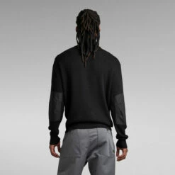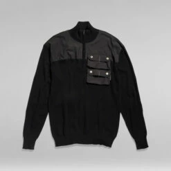 Knitted sweater Swiss Army features woven details at the shoulders and elbows. A comfortable raised neckline is finished with a short zipper to allow for an open collar as well. At the chest, a double flap pocket with snap buttons is created. The ‘strike through’ embroidery stitch indicates the center.