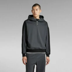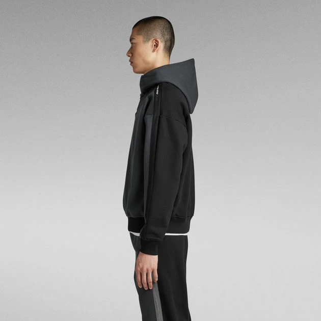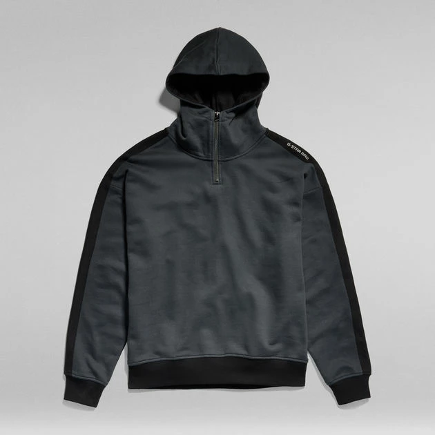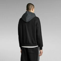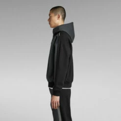 Hooded sweater Tape Color Block features a lined hood with a raised front and a short zipper. When opened, a gusset appears offering a wider neckline that still adds protection. The front and back show a different color, while the woven tape adds detail to the sleeves. The cuffs and bottom edge are created out of ribbed fabric to complete this color block hoodie.