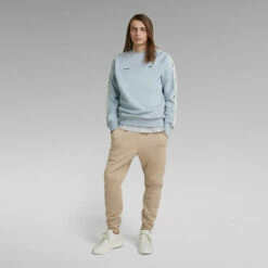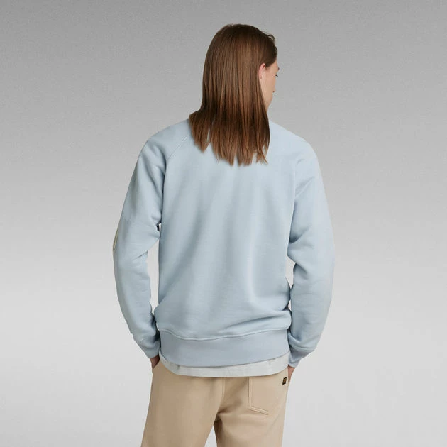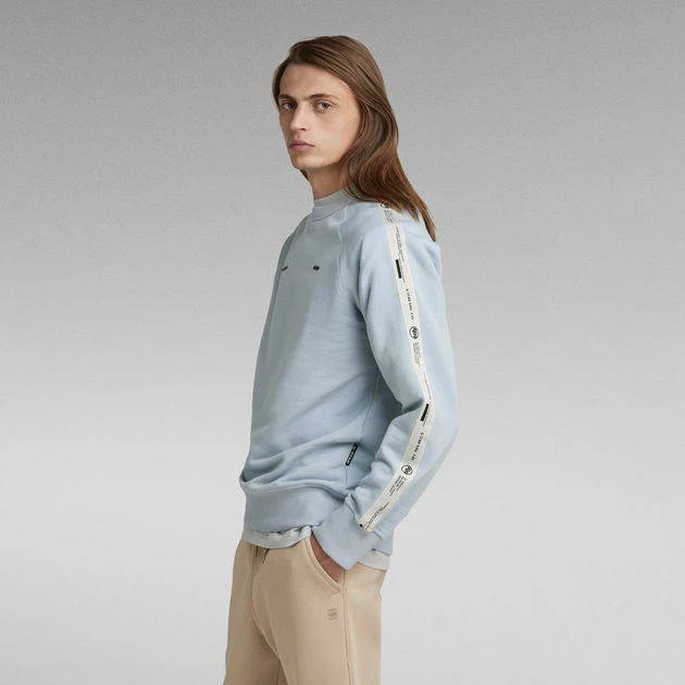 This Raglan Tape sweater features a straight fit with a rounded neckline and ribbed finished edges. The long sleeves show a raglan inset and are covered by a woven tape with a graphic design.