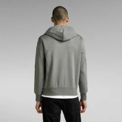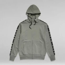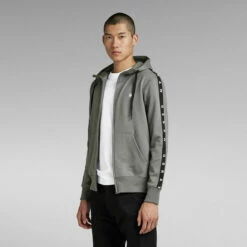 Zip thru hoodie Tape Zip is designed in a straight fit and offers a G-Star RAW woven tape along both sleeves. The hood shows a raised front with a drawstring closure. A split kangaroo pocket completes it.
