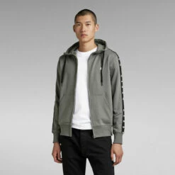 Zip thru hoodie Tape Zip is designed in a straight fit and offers a G-Star RAW woven tape along both sleeves. The hood shows a raised front with a drawstring closure. A split kangaroo pocket completes it.