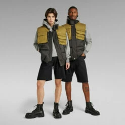 Utility vest Attac PM shows a raised collar with an extended tab. When a regular collar is preferred, this section can be folded back towards the Velcro patch. Flap pockets with a hidden snap closure are added to the chest. The ‘strike through’ embroidery stitch indicates the entrance. Welt pockets are added to the waist and offer a hidden snap as well. This sleeveless jacket features a 2-way zipper covered by a panel with snaps. Inside, an additional inner pocket and hanger loop are added for ease.