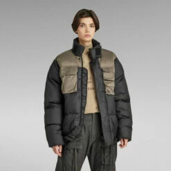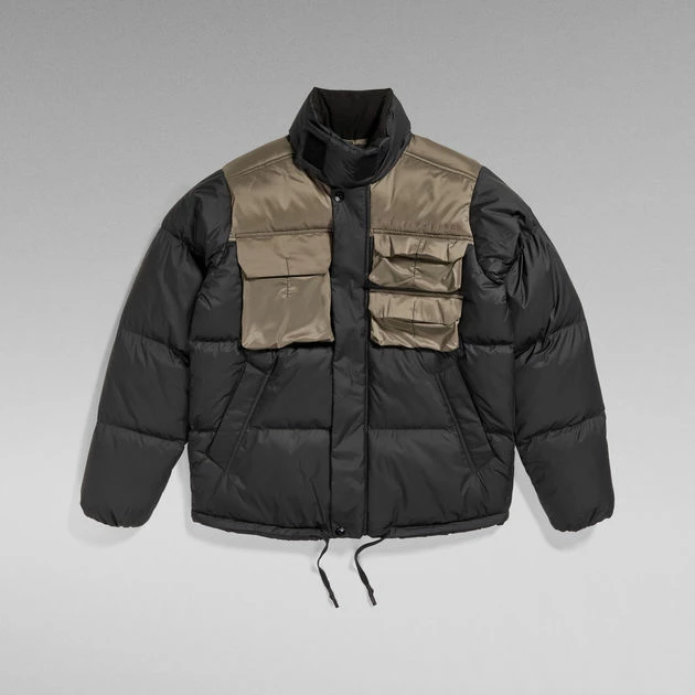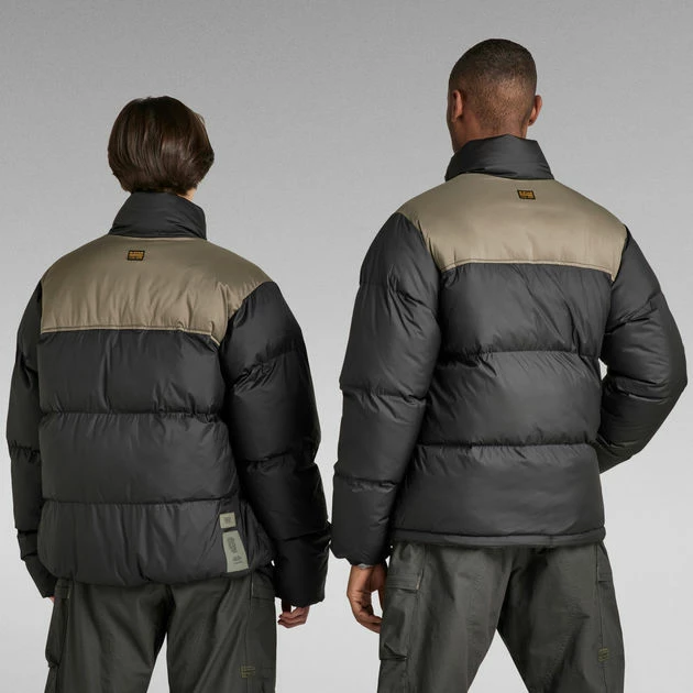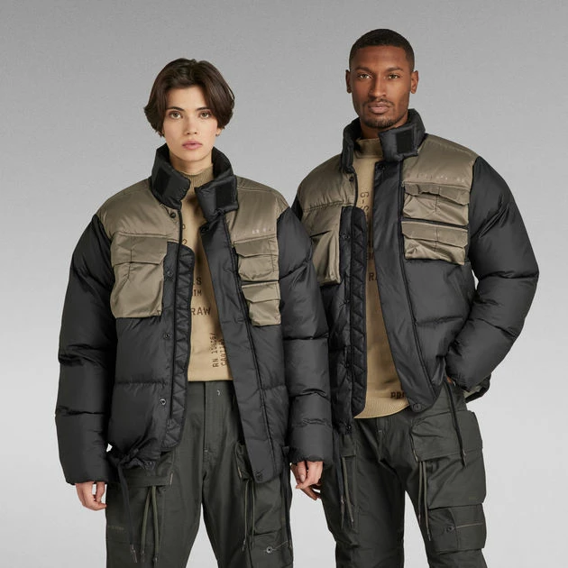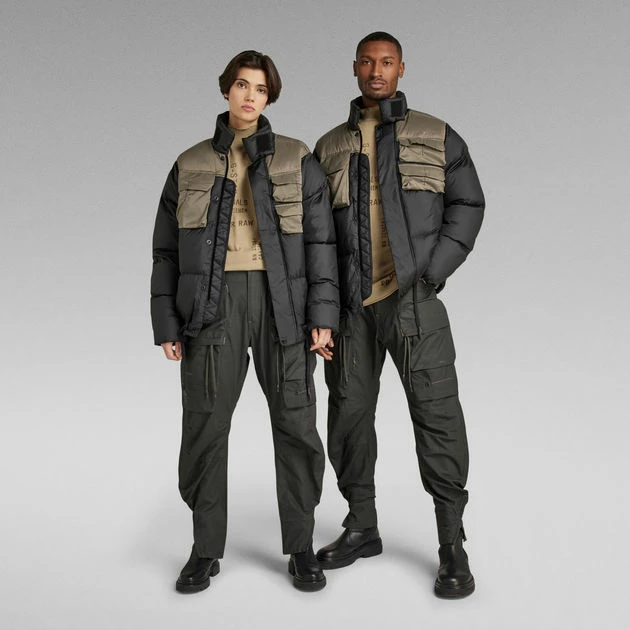 Utility Puffer Attac shows a raised collar with an extended tab. When a regular collar is preferred, this section can be folded back towards the Velcro patch. Flap pockets with a hidden snap closure are added to the chest. The ‘strike through’ embroidery stitch indicates the entrance. At the waist, welt pockets are created with a hidden snap as well. This unisex jacket features a 2-way zipper covered by a panel with snaps. Inside, an additional inner pocket and hanger loop are added for ease. Unisex sizing runs as men’s sizing.