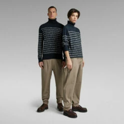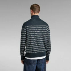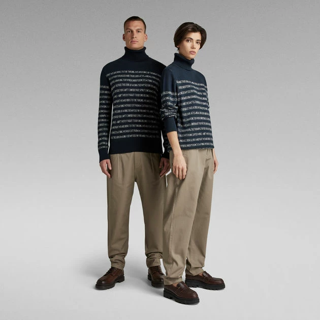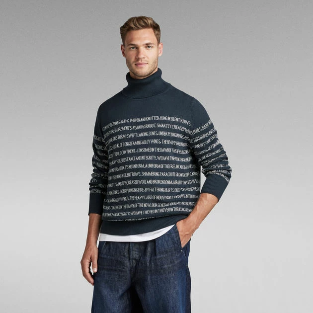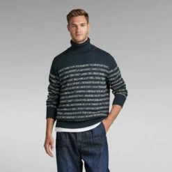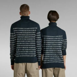 Knitted sweater Jacquard Stripe is designed in a straight fit and offers a horizontal stripe design. These wide stripes are knitted in and created by a graphic text. A comfortable turtleneck completes this unisex sweater. Unisex sizing runs as men’s sizing.