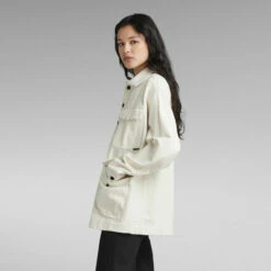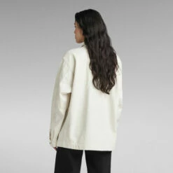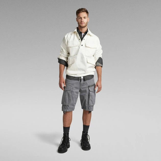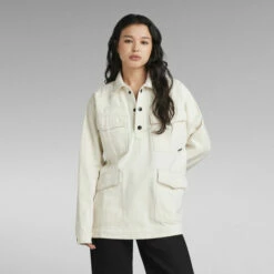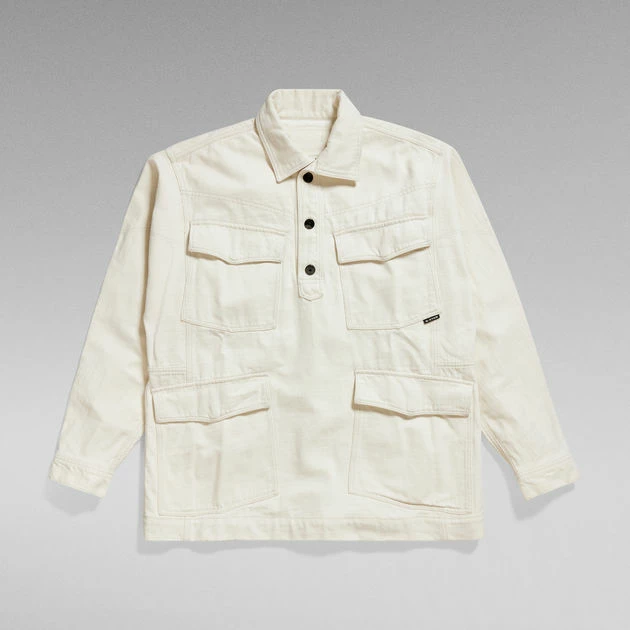This Shanorak shows a shirt collar with a snap button placket. Flap pockets are set at the chest and waist, offering a hidden snap closure. Volume can be created by pulling the drawcord at the bottom edge. This unisex shirt is reinforced at the upper sleeves and back through the double stitch row applied.