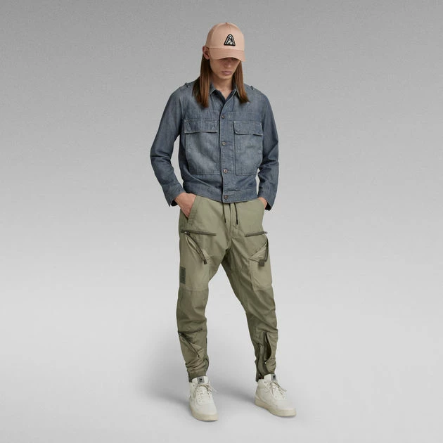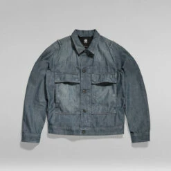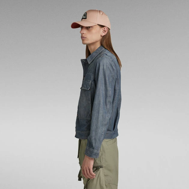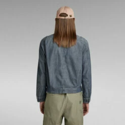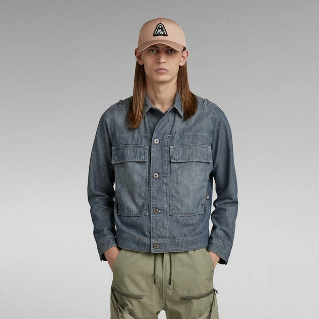 The design of this Utility jacket features flap pockets with additional side entry pockets. Hidden snap closures ensure a firm closure. Volume is created at the back by the folded pleats that are caught in the waistband. Shoulder loops with a strike through stitch create even more detail to this denim jacket.